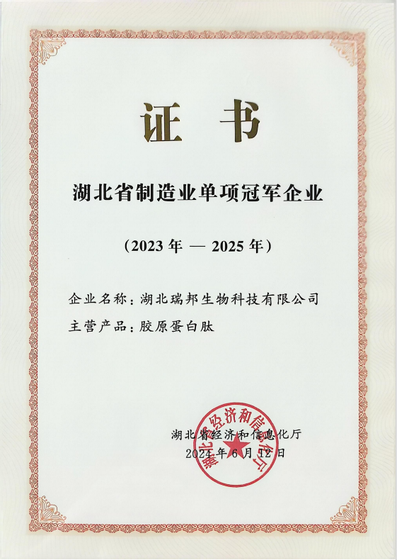 公司是国家级高新技术企业,现有生物活性肽技术工程研究中心、生物活性肽企业技术中心企业、专家工作站等4个研发平台,同时被授予“国家循环经济示范企业”、“守合同重信用企业”、”支柱产业细分领域隐形冠军示范企业”、“专精特新小巨人企业”、“湖北省重点建设项目”等荣誉称号;同时公司通过了FSSC 22000质量体系认证,halal清真认证,食品生产许可证等,FDA认证。